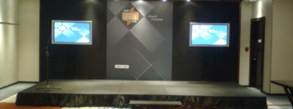 We provided a 6m x 2.4m stage. The logos of the conference sponsors were printed on a large banner that was placed behind the stage and two front projection screens were placed, one left and one right of the stage. The lectern was used for presentations and panel discussions were done with hand held microphones. Two plasma screens were used as confidence monitors and we used a four speaker sound system. The presentations were loaded at the back and a second laptop was used to show the results of the votes cast by the delegates.