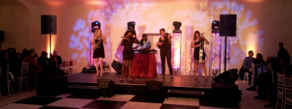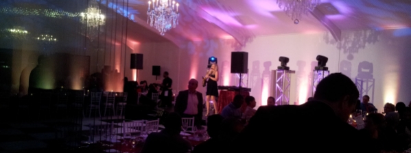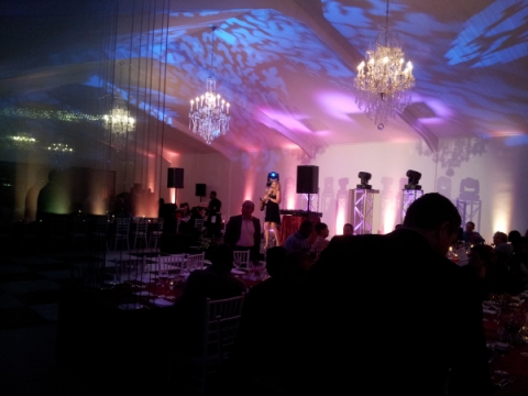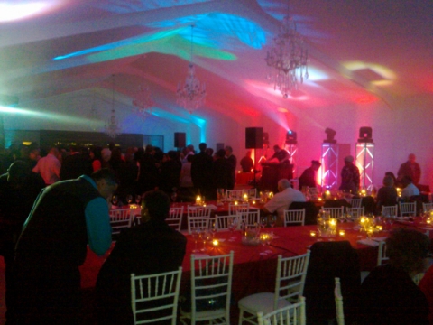 There was a comedian, a band with dancers and a DJ for the evening’s entertainment. We provided a six speaker P.A with sub woofers, microphones, five stage monitors, DJ cd players & mixer, a stage, a dance floor, smoke machine and lighting. The room was lit with LED par cans as up lighters, the stage was lit with profile spot lights and the stage and dance floor was lit with six Martin Mac 250 fixtures on truss totems.
